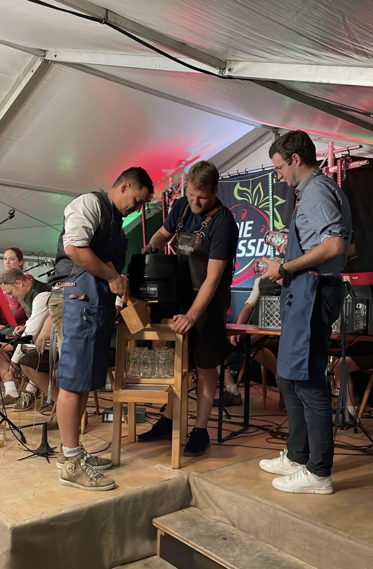 Bieranstich am Freitag: 1. Bürgermeister Tobias Strauß zusammen mit unserem Brauer Christian Rook und einem Vertreter der Sparkasse.